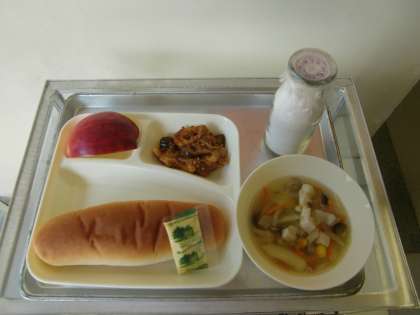なすのミートグラタン・鶏肉と野菜のスープ・りんご・大型コッペパン・牛乳です。