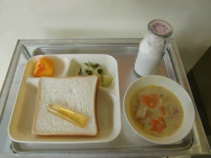 コーンクリームシチュー・キャベツと三度豆のサラダ・かき(平核無柿)・食パン・牛乳です。