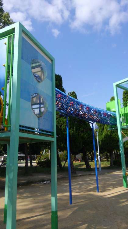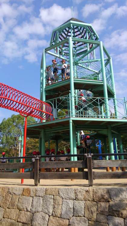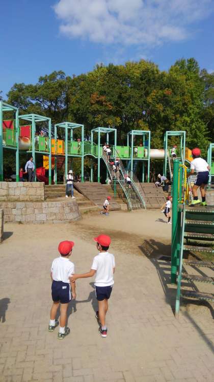 大阪城公園に到着し、早速子どもたちは遊具で遊んでいます。(9時50分現在)
