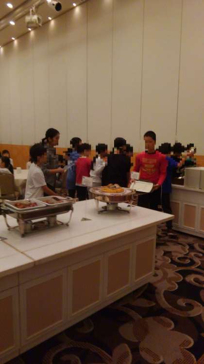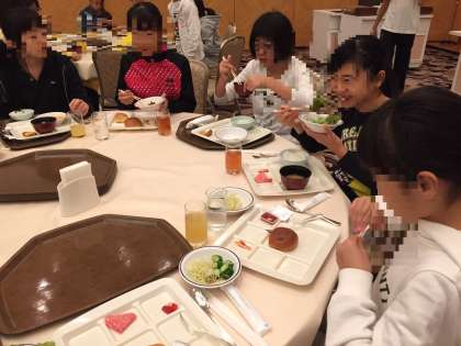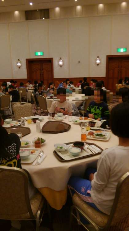 体を動かしたら、お腹が空きました。バイキング形式の朝食です。たくさん選んで食べてます。(7時9分現在)