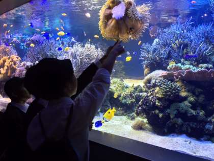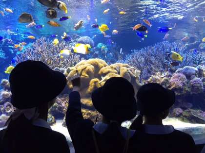 きれいな魚がたくさんいます。みんな興味津々で水槽を覗き込んでいます。