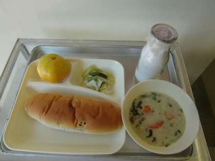きのこのクリームシチュー・キャベツと三度豆のサラダ・みかん・レーズンパン・牛乳です。
