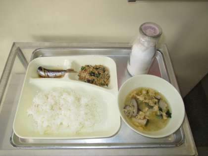 いわしのしょうが煮・かきたま汁・高野どうふのいり煮・ご飯・牛乳