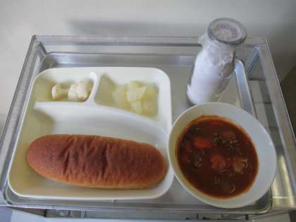 ビーフシチュー・カリフラワーのピクルス・和なし(缶)・ライ麦パン・牛乳です。