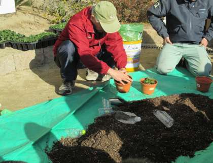 本日、6年生はパンジーの苗を鉢に植え替える作業をしました。