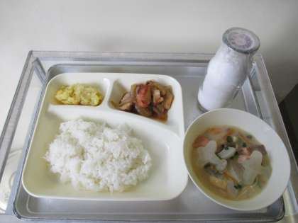 「かす汁」は、酒かすを入れた具だくさんの汁ものです。酒かすの働きで体が温まるので、冬に食べられることが多いです。今日の給食のかす汁は、さけやこんにゃく、だいこん、青ねぎなどが入っています。