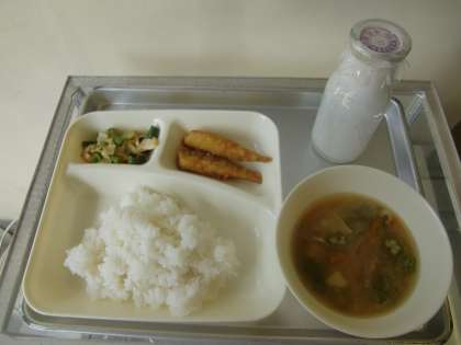 いわしてんぷら・みそ汁・キャベツと三度豆のごまあえ・ごはん・牛乳