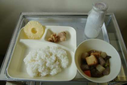 鶏肉のたつたあげ・あつあげと干しずいきの煮もの・パインアップル(缶)・ごはん・牛乳です。