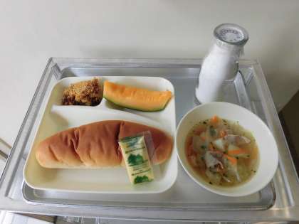 カレードリア・キャベツのスープ・クインシーメロン・大型コッペパン・牛乳です。