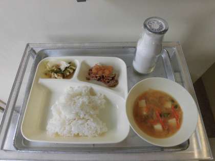 豚肉のおろしじょうゆかけ・みそ汁・野菜いため・ご飯・牛乳です。
