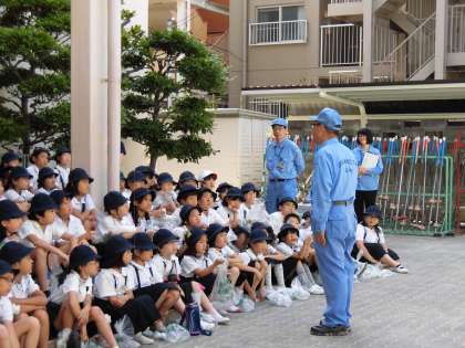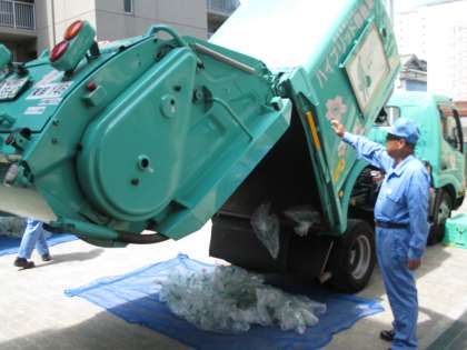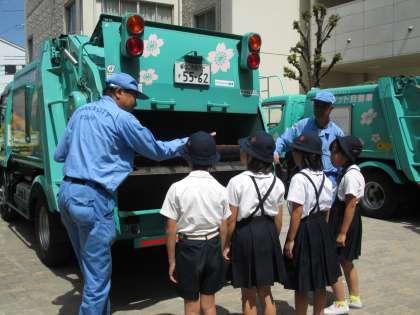 環境局より、パッカー車を2台持ってきていただきました。子どもたちは資源ゴミをパッカー車にいれる体験をしました。資源ゴミのパッカー車は、リサイクルしやすいように圧縮しないで集めているそうです。そして資源ゴミはリサイクルされ、別のものに生まれ変わるそうです。