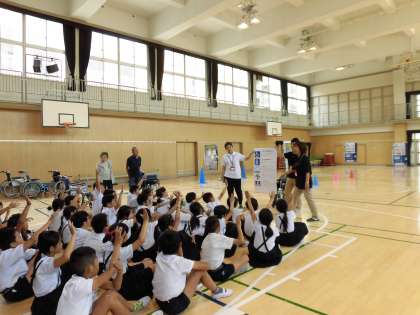 「東成区社会福祉協議会」の方に来ていただき、車いすについて色々と教えていただきました。子どもたちは、車いすの使い方、動かし方、乗っている人への気遣いなどを見本を見せていただきながら、お話を聞きました。
