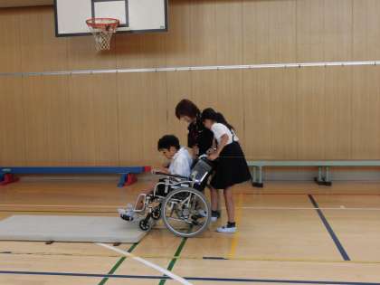 その後、車いすに乗る体験、押す体験を講堂内で行いました。段差を通る際に車いすを傾けるときには声をかけるなど、車いすに座っている人が安心できるように押します。最近の自動販売機は、車いすに乗ったまま購入できるように配慮がされていることにも気づくことが出来ました。