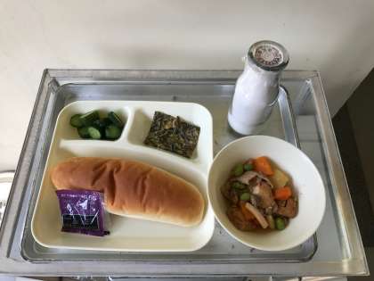 もずく入りヒラヤーチー・豚肉といかの煮もの・あっさりきゅうり・大型コッペパン・牛乳です。
