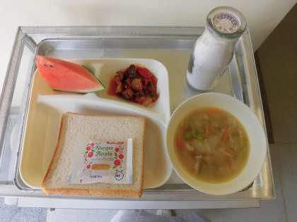 押し麦のスープ・夏野菜とベーコンのソテー・すいか・食パン・牛乳です。