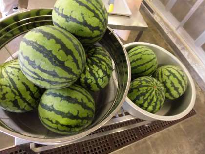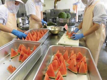 本日の「すいか」は大きな1玉を、64等分に切り分けます。給食室では、10玉分を調理員さんが切り分けてくださいました。甘くておいしいすいかでした。