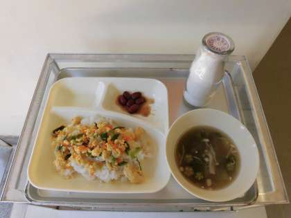 親子丼・とうがんのすまし汁・金時豆の煮もの・ご飯・牛乳です。
