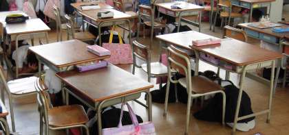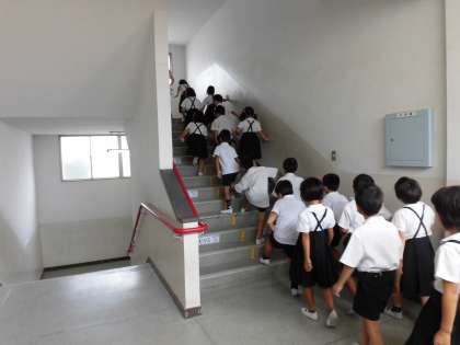 地震発生の放送の後、机の下で地震の揺れが収まるまで待ちます。その後、津波が起こるという放送後、浸水に備え校舎の三階へと避難しました。