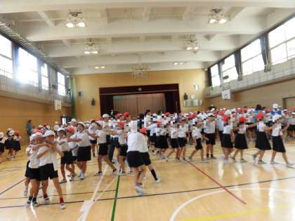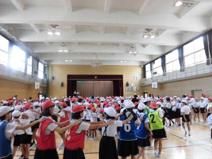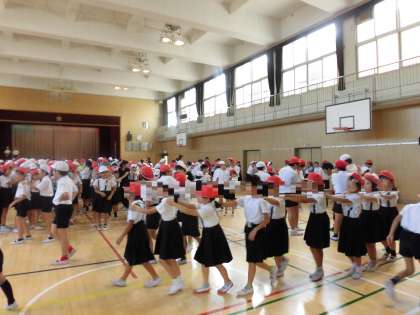 じゃんけんをして、負けた人が勝った人の後ろにつながっていき列車をつくっていきます。じゃんけんをするごとにどんどん、列車が長くなっていきます。子どもたちは、自分たちの列車をより長くしようと、一所懸命でした。