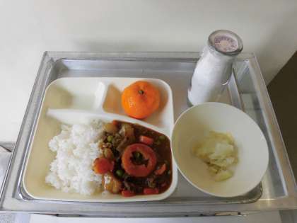 ビーフカレーライス[米粉]・キャベツのピクルス・みかん(冷)・牛乳です。