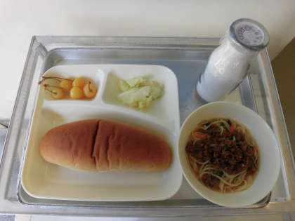 タンタンめん・キャベツの甘酢づけ・さくらんぼ(缶)・黒糖パン・牛乳です。