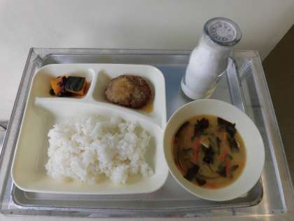 和風おろしハンバーグ・みそ汁・かぼちゃのいとこ煮・ご飯・牛乳です。