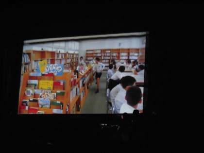その寸劇は、「図書室で騒いでいた人を裁判にかける」内容で、映像を交えながら面白おかしく出来ていました。本当に楽しい内容で、子どもたちは大喜びで見ていました。