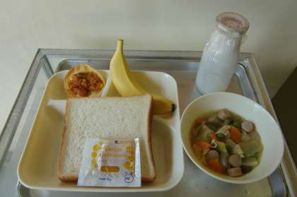 豚肉とキャベツのスープ煮・変わりピザ・バナナ・食パン・牛乳