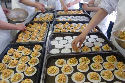 写真は給食室での作業風景です。人数分、一枚づつ丁寧に具を乗せています。
