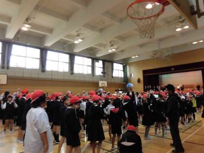 ボール渡しは、グループの結束力がいいのでしょうか。すごいスピードで渡っていました。きゃっきゃと楽しいそうな声が講堂に響き渡っていました。