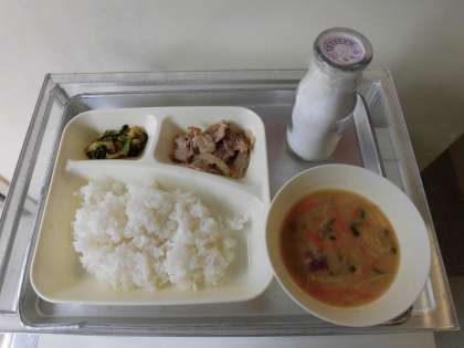 豚肉のしょうが焼き・さつまいものみそ汁・きくなとはくさいのごまあえ・ご飯・牛乳です。