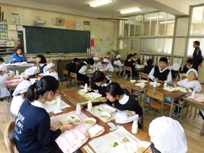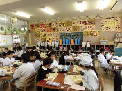特に年齢差のある1年生・6年生クラスのことです。1年生は6年生の食べっぷりに驚いて、あっけにとられていました。どのクラスもいつもと違う雰囲気の中、緊張しながらも楽しそうに給食を食べていました。