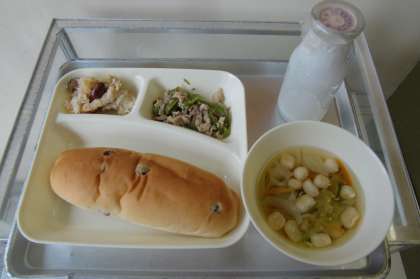 豚肉とピーマンのいためもの・すまし汁・金時豆のおこわ・レーズンパン・牛乳