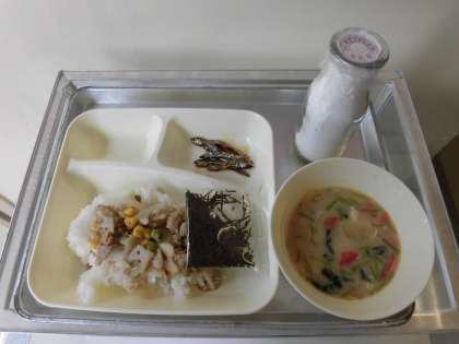 れんこんのちらしずし・ぞう煮・ごまめ・牛乳です。