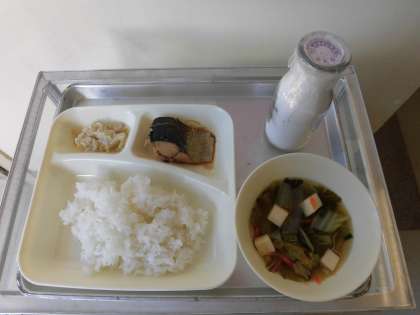 さばのみそ煮・すまし汁・もやしのゆずの香あえ・ご飯・牛乳です。