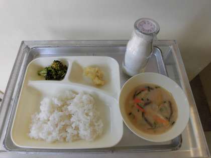 かす汁・ブロッコリーのごまあえ・くりきんとん・ご飯・牛乳です。