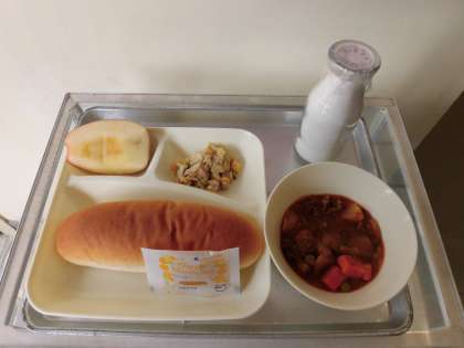 ビーフシチュー・ツナとキャベツのソテー・りんご・大型コッペパン・牛乳です。