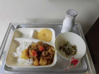 ポークカレーライス・ごぼうサラダ・パインアップル(缶)・牛乳です。