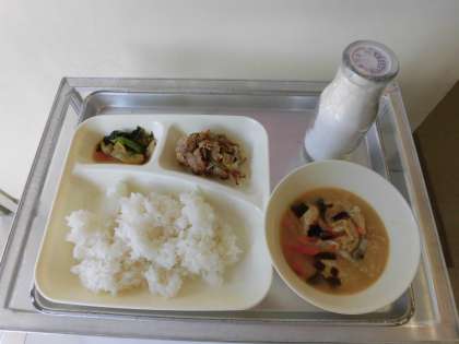 豚肉のごまだれ焼き・みそ汁・きくなとはくさいのおひたし・ご飯・牛乳です。