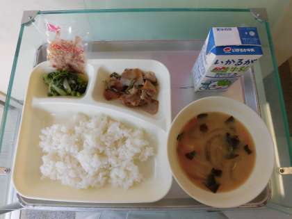 豚肉の梅風味焼き・みそ汁・菜の花のおひたし・ご飯・牛乳です。