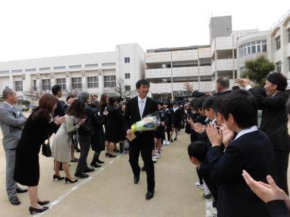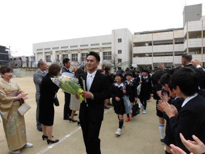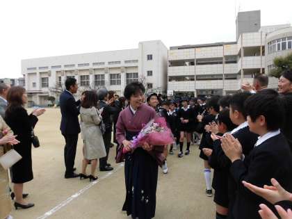 式を終え、各教室で最後のホームルームを行いました。教室に別れを告げるのが、名残惜しい様子でした。その後、運動場に保護者の方・在校生・教職員で作った花道を通って、片江小学校を後にしました。式で涙を見せていた子どもも、このころには素敵な笑顔に戻っていました。卒業生のみなさん、元気でお過ごしください。中学校へ進学した後も、片江小学校に遊びに来てください、待っていますね。