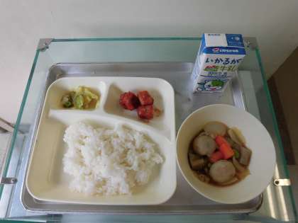 まぐろのオーロラ煮・さといもと野菜の含め煮・キャベツの梅風味・ご飯・牛乳です。