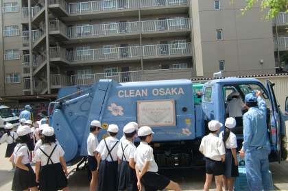 子どもたちは、パッカー車に乗せていただき、「運転席から、周りをみてごらん。車の周りに人がいても見えないでしょう?だから、ゴミ回収の時、パッカー車のまわりにいると危ないんだよ。」というお話を聞きました。実際に運転席に乗ってみることで、うんうんとうなずく子どもがたくさんいました。