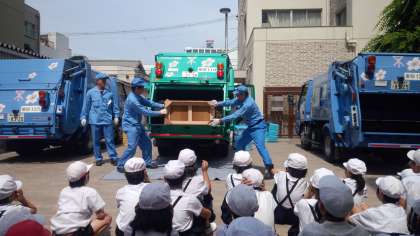 また、パッカー車に家具を入れて、どのように圧縮されるのかを見せていただきました。子どもたちは家具がつぶれる時の大きな音に驚いていました。