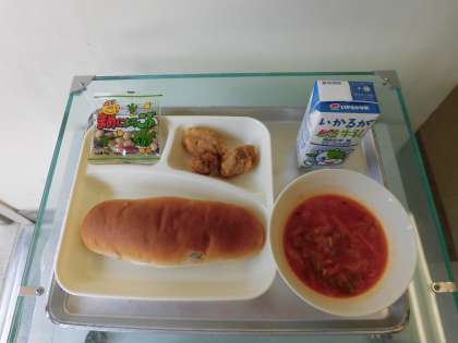 一口トンカツ・ミネストローネ・豆こんぶ・レーズンパン・牛乳です。