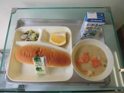 コーンクリームシチュー・キャベツのひじきドレッシング・河内ばんかん・大型コッペパン・牛乳です。