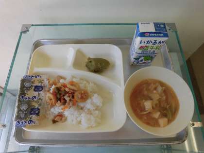 かやくご飯・みそ汁・まっ茶ういろう・牛乳です。