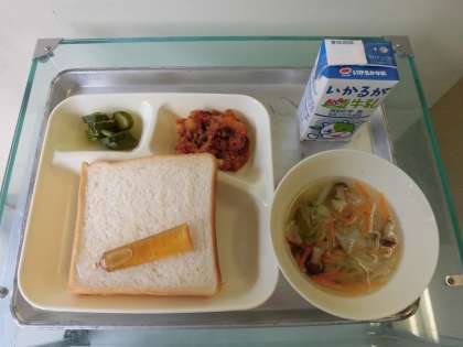 じゃがいものミートグラタン・スープ・きゅうりのピクルス・食パン・牛乳です。