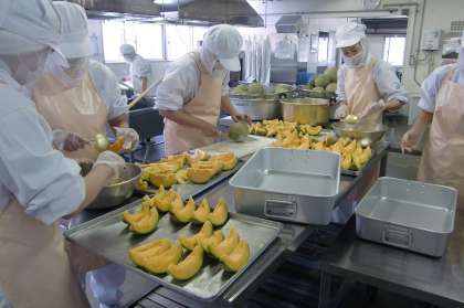 「クインシーメロン」は一年に一度登場します。給食室でメロンを洗い、切って種を取ります。そしてクラスごとのバットに並べます。