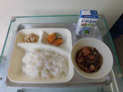 すき焼き煮・焼きかぼちゃの甘みつかけ・もやしのごま酢あえ・ご飯・牛乳です。